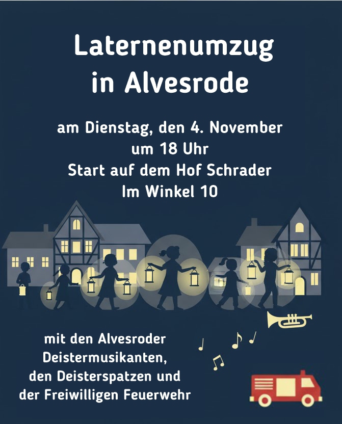 Laternenumzug in Alvesrode Beitrags-Autor:Caroline Gonschorek Beitrag veröffentlicht:21. Oktober 2025 Beitrags-Kommentare:0 Kommentare Das könnte dir auch gefallen Zuammenfassung Ortsratssitzung 27.02.2023 19. Februar 2023 Halloween in Alvesrode 21. Oktober 2025 Update Notfallplan 1. September 2024 Schreibe einen Kommentar Antwort abbrechenKommentierenGib deinen Namen oder Benutzernamen zum Kommentieren ein Gib deine E-Mail-Adresse zum Kommentieren ein Gib deine Website-URL ein (optional) Meinen Namen, meine E-Mail-Adresse und meine Website in diesem Browser für die nächste Kommentierung speichern.